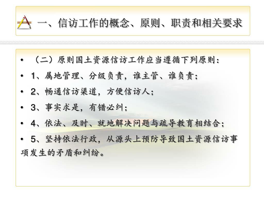一、信访工作的概念、原则、职责和相关要求 • (二)原则国土资源信访工作应当遵循下列原则: • 1、属地管理、分级负责,谁主管、谁负责; • 2、畅通信访渠道,方便信访人; • 3、事实求是,有错必纠; • 4、依法、及时、就地解决问题与疏导教育相结合; • 5、坚持依法行政,从源头上预防导致国土资源信访事项发生的矛盾和纠纷。
