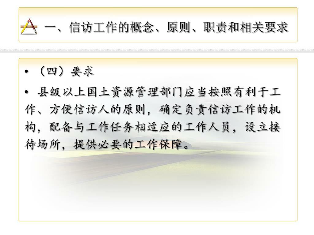 一、信访工作的概念、原则、职责和相关要求 • (四)要求 • 县级以上国土资源管理部门应当按照有利于工作、方便信访人的原则,确定负责信访工作的机构,配备与工作任务相适应的工作人员,设立接待场所,提供必要的工作保障。