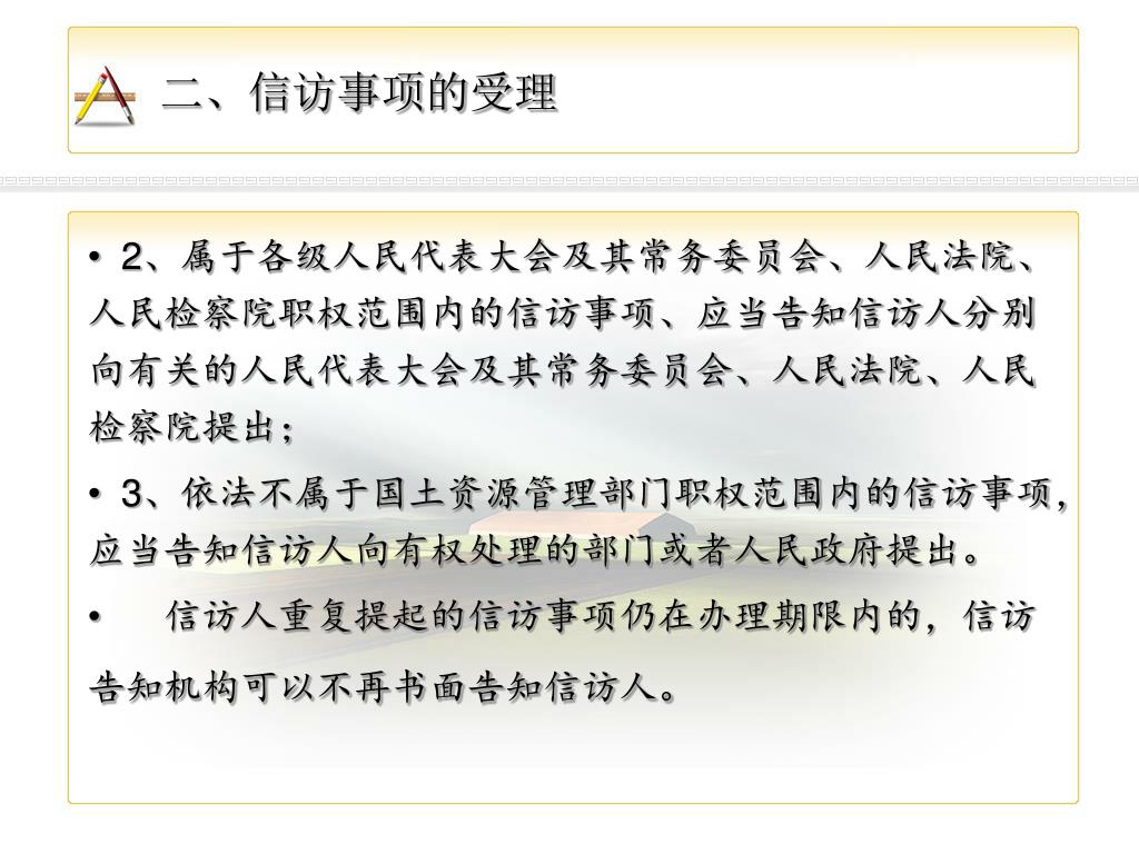 二、信访事项的受理 • 2、属于各级人民代表大会及其常务委员会、人民法院、人民检察院职权范围内的信访事项、应当告知信访人分别向有关的人民代表大会及其常务委员会、人民法院、人民检察院提出; • 3、依法不属于国土资源管理部门职权范围内的信访事项,应当告知信访人向有权处理的部门或者人民政府提出。 • 信访人重复提起的信访事项仍在办理期限内的,信访告知机构可以不再书面告知信访人。