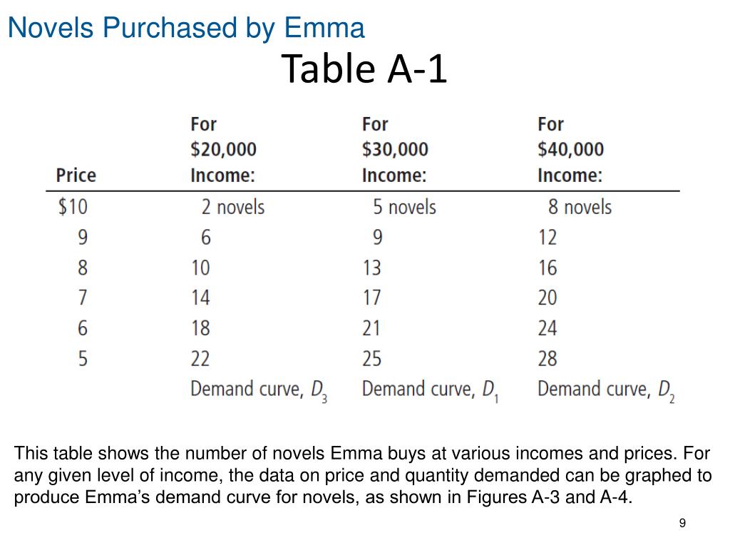 Novels Purchased by Emma Table A-1 This table shows the number of novels Emma buys at various incomes and prices. For any given level of income, the data on price and quantity demanded can be graphed to produce Emma’s demand curve for novels, as shown in Figures A-3 and A-4.