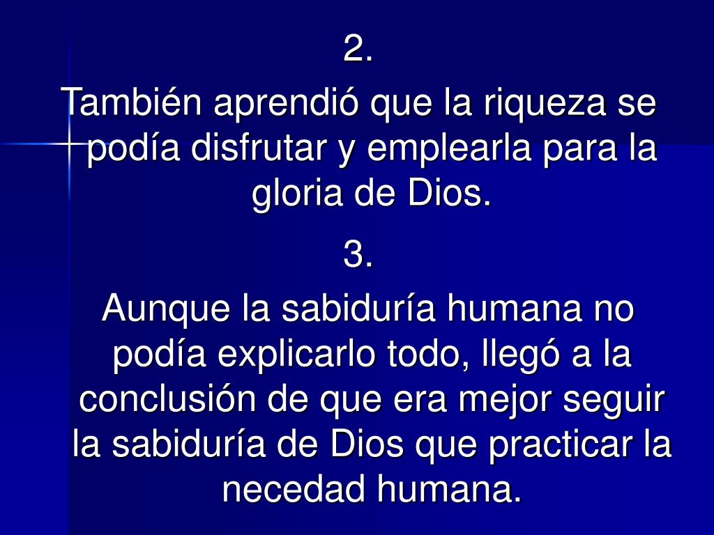 2. También aprendió que la riqueza se podía disfrutar y emplearla para la gloria de Dios. 3. Aunque la sabiduría humana no podía explicarlo todo, llegó a la conclusión de que era mejor seguir la sabiduría de Dios que practicar la necedad humana.