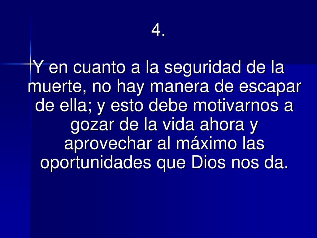 4. Y en cuanto a la seguridad de la muerte, no hay manera de escapar de ella; y esto debe motivarnos a gozar de la vida ahora y aprovechar al máximo las oportunidades que Dios nos da.