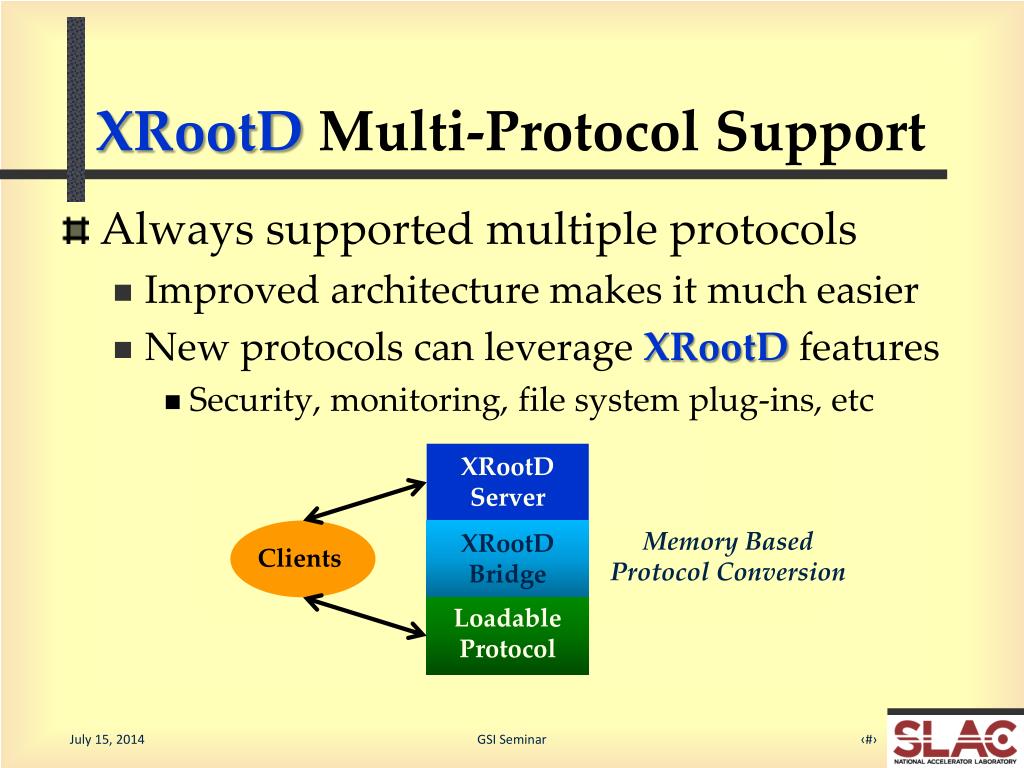 XRootDMulti-Protocol Support • Always supported multiple protocols • Improved architecture makes it much easier • New protocols can leverage XRootDfeatures • Security, monitoring, file system plug-ins, etc XRootD Server Memory Based Protocol Conversion XRootD Bridge Clients Loadable Protocol