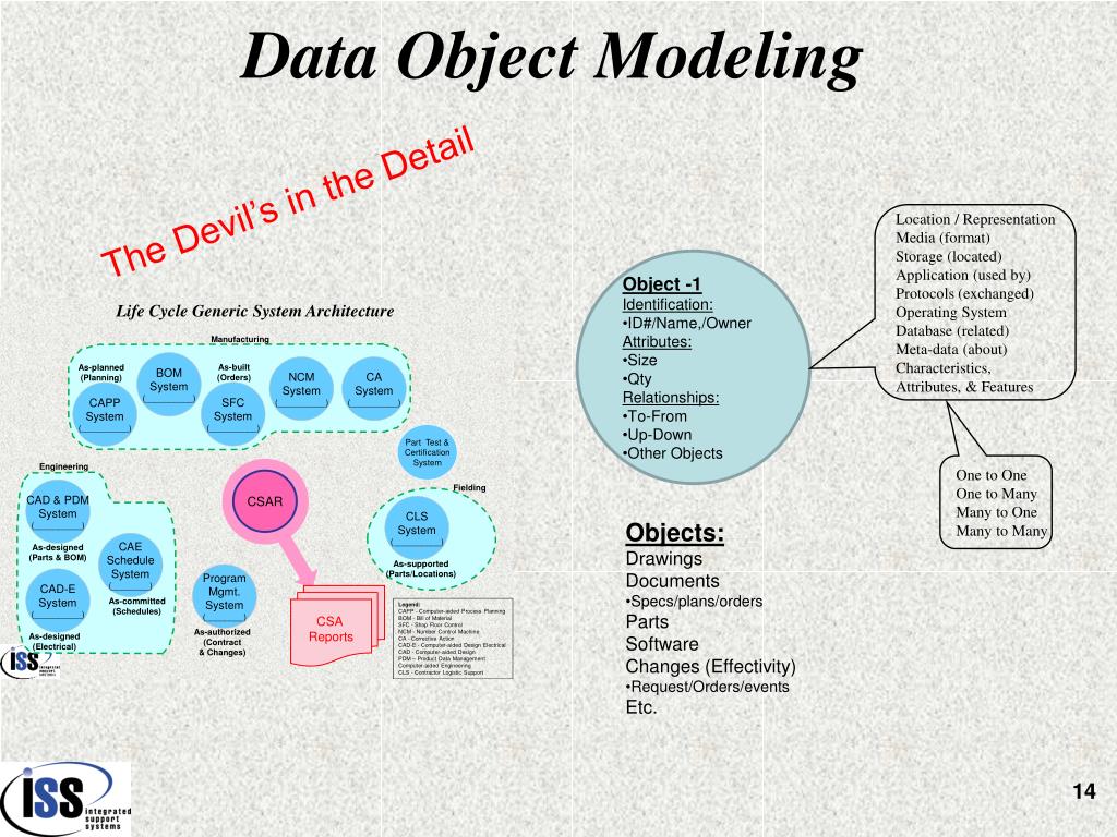 Data Object Modeling The Devil’s in the Detail Location / Representation Media (format) Storage (located)Application (used by) Protocols (exchanged) Operating System Database (related) Meta-data (about) Characteristics, Attributes, & Features • Object -1 • Identification: • ID#/Name,/Owner • Attributes: • Size • Qty • Relationships: • To-From • Up-Down • Other Objects One to One One to Many Many to One Many to Many • Objects: • Drawings • Documents • Specs/plans/orders • Parts • Software • Changes (Effectivity) • Request/Orders/events • Etc.