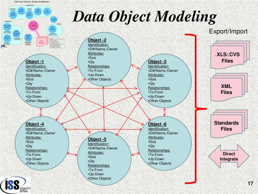Data Object Modeling Export/Import • Object -2 • Identification: • ID#/Name,/Owner • Attributes: • Size • Qty • Relationships: • To-From • Up-Down • Other Objects .XLS/.CVS Files • Object -1 • Identification: • ID#/Name,/Owner • Attributes: • Size • Qty • Relationships: • To-From • Up-Down • Other Objects • Object -3 • Identification: • ID#/Name,/Owner • Attributes: • Size • Qty • Relationships: • To-From • Up-Down • Other Objects XML Files Standards Files • Object -4 • Identification: • ID#/Name,/Owner • Attributes: • Size • Qty • Relationships: • To-From • Up-Down • Other Objects • Object -6 • Identification: • ID#/Name,/Owner • Attributes: • Size • Qty • Relationships: • To-From • Up-Down • Other Objects • Object -5 • Identification: • ID#/Name,/Owner • Attributes: • Size • Qty • Relationships: • To-From • Up-Down • Other Objects Direct Integrate