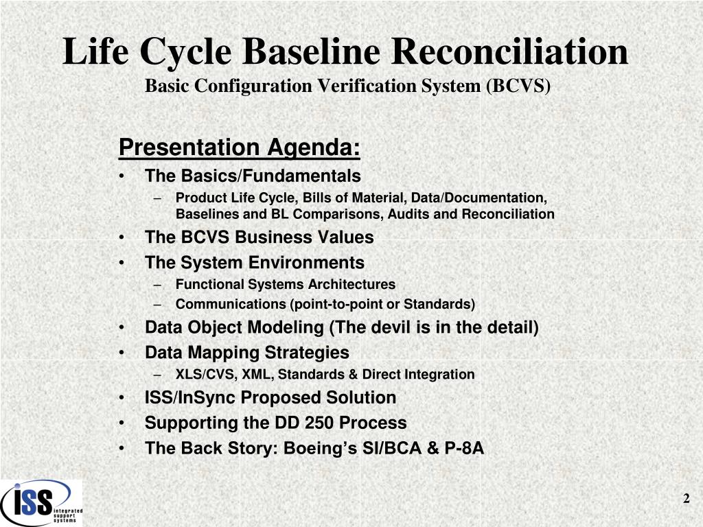 Life Cycle Baseline Reconciliation Basic Configuration Verification System (BCVS) Presentation Agenda: • The Basics/Fundamentals • Product Life Cycle, Bills of Material, Data/Documentation, Baselines and BL Comparisons, Audits and Reconciliation • The BCVS Business Values • The System Environments • Functional Systems Architectures • Communications (point-to-point or Standards) • Data Object Modeling (The devil is in the detail) • Data Mapping Strategies • XLS/CVS, XML, Standards & Direct Integration • ISS/InSync Proposed Solution • Supporting the DD 250 Process • The Back Story: Boeing’s SI/BCA & P-8A