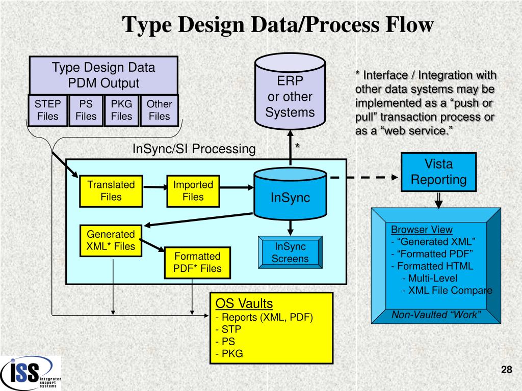 Type Design Data/Process Flow ERP or other Systems Type Design Data PDM Output * Interface / Integration with other data systems may be implemented as a “push or pull” transaction process or as a “web service.” STEP Files PS Files PKG Files Other Files * InSync/SI Processing Vista Reporting InSync Translated Files Imported Files Browser View - “Generated XML” - “Formatted PDF” - Formatted HTML - Multi-Level - XML File Compare Non-Vaulted “Work” Generated XML* Files InSync Screens Formatted PDF* Files OS Vaults - Reports (XML, PDF) - STP - PS - PKG