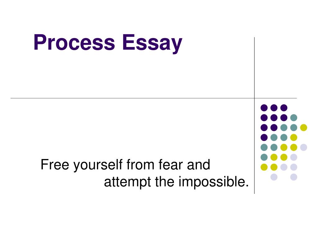 Process Essay. Free yourself from fear and attempt the impossible. What Is a Process Analysis?. When a writer lists the steps involved in how to accomplish something, he is outlining a process.
