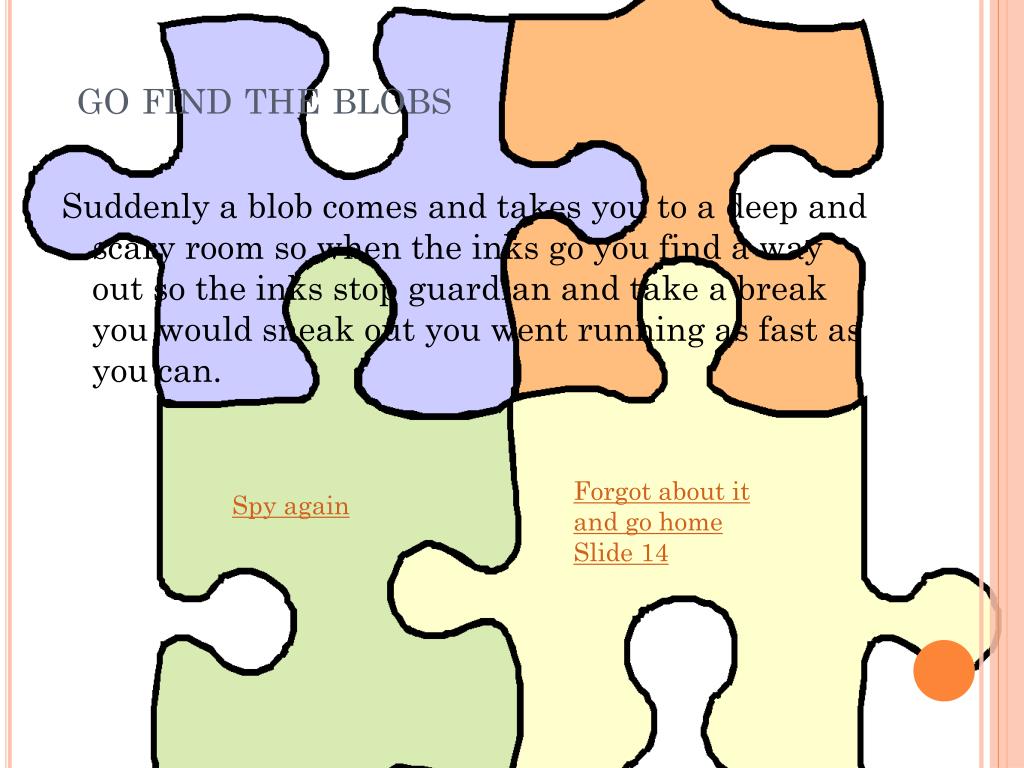 go find the blobs Suddenly a blob comes and takes you to a deep and scary room so when the inks go you find a way out so the inks stop guardian and take a break you would sneak out you went running as fast as you can. Forgot about it and go home Slide 14 Spy again