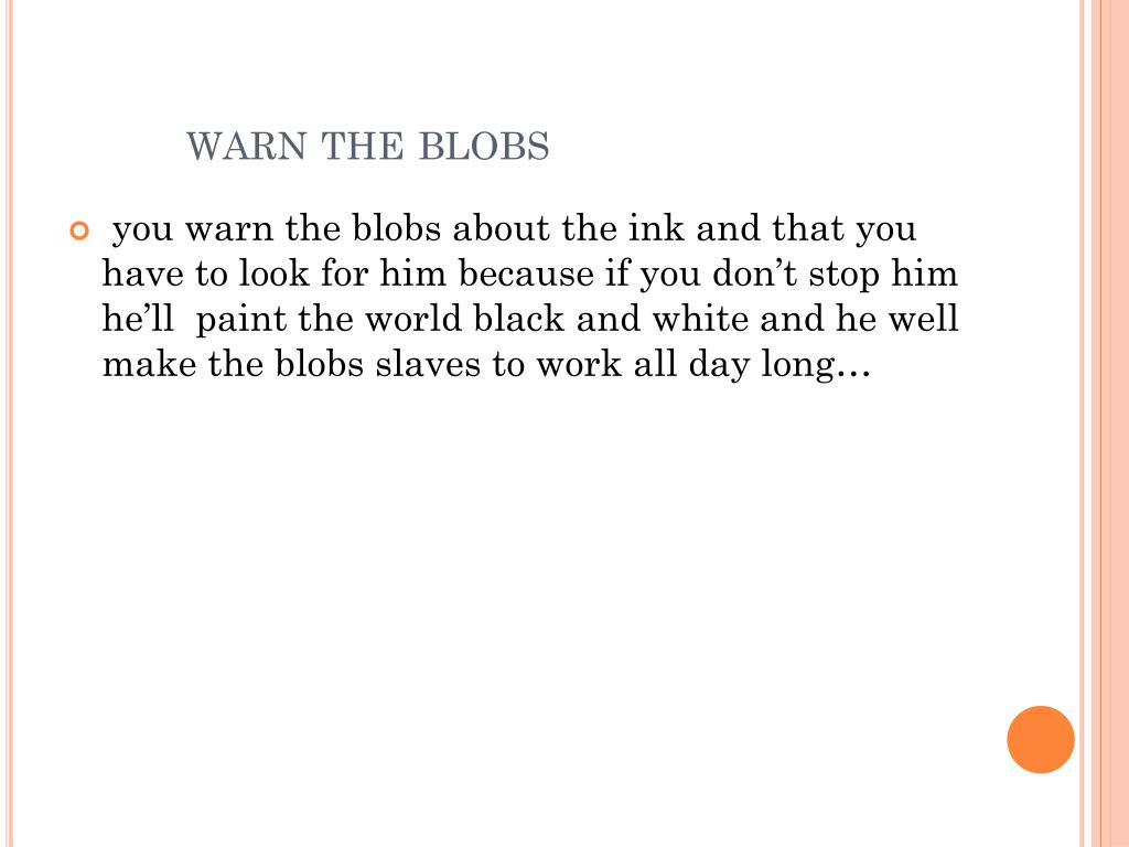 warn the blobs • you warn the blobs about the ink and that you have to look for him because if you don’t stop him he’ll paint the world black and white and he well make the blobs slaves to work all day long…