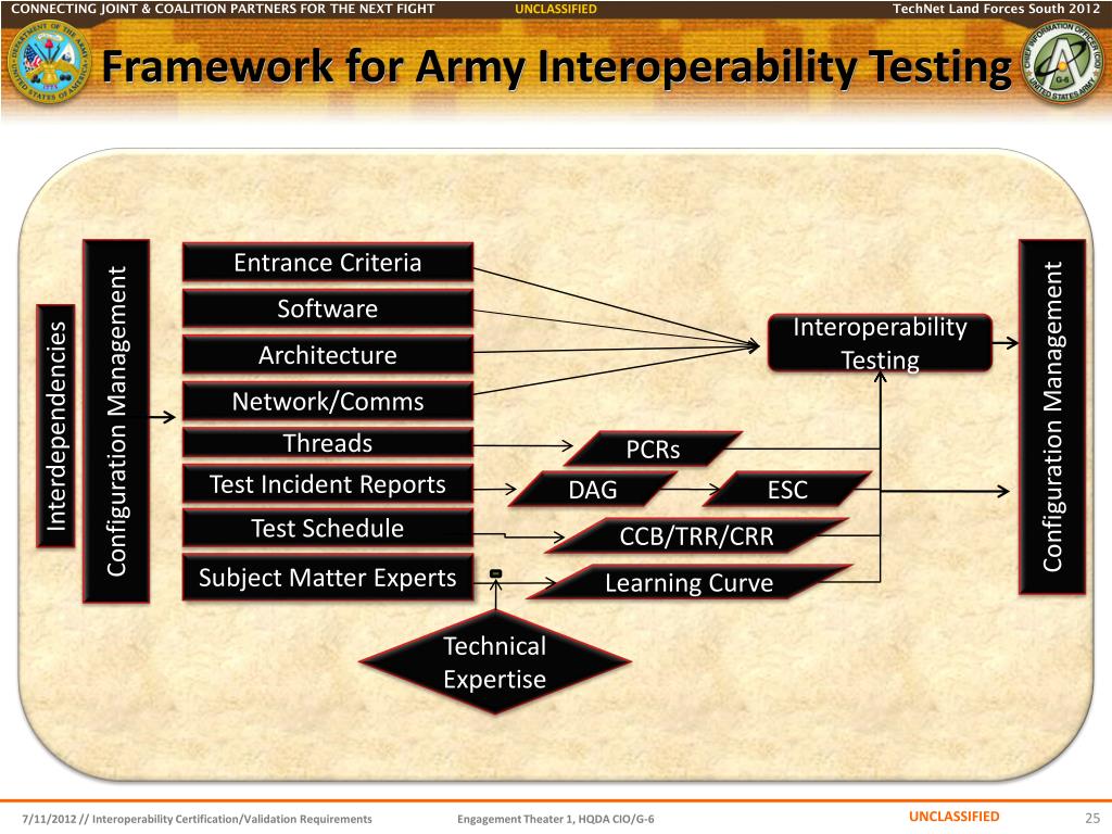 Framework for Army Interoperability Testing Entrance Criteria Software Interoperability Testing Architecture Network/Comms Configuration Management Configuration Management Interdependencies Threads PCRs Test Incident Reports DAG ESC Test Schedule CCB/TRR/CRR Subject Matter Experts Learning Curve Technical Expertise Engagement Theater 1, HQDA CIO/G-6