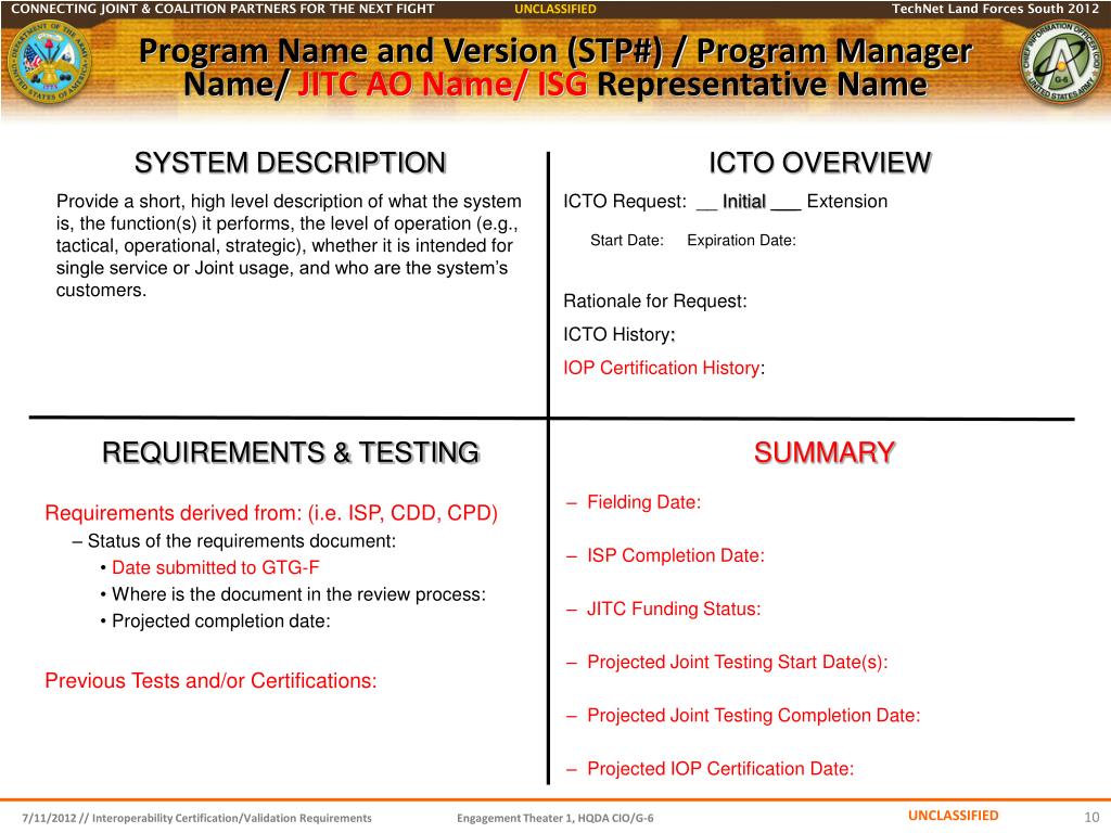 Program Name and Version (STP#) / Program Manager Name/ JITC AO Name/ ISG Representative Name SYSTEM DESCRIPTION Provide a short, high level description of what the system is, the function(s) it performs, the level of operation (e.g., tactical, operational, strategic), whether it is intended for single service or Joint usage, and who are the system’s customers. ICTO OVERVIEW ICTO Request: __Initial __ Extension Start Date: Expiration Date: Rationale for Request: ICTO History: IOP Certification History: • REQUIREMENTS & TESTING • Requirements derived from: (i.e. ISP, CDD, CPD) • Status of the requirements document: • Date submitted to GTG-F • Where is the document in the review process: • Projected completion date: • Previous Tests and/or Certifications: • SUMMARY • Fielding Date: • ISP Completion Date: • JITC Funding Status: • Projected Joint Testing Start Date(s): • Projected Joint Testing Completion Date: • Projected IOP Certification Date: Engagement Theater 1, HQDA CIO/G-6