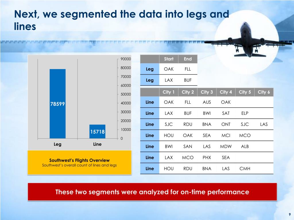 Next, we segmented the data into legs and lines Southwest’s Flights Overview Southwest’s overall count of lines and legs These two segments were analyzed for on-time performance