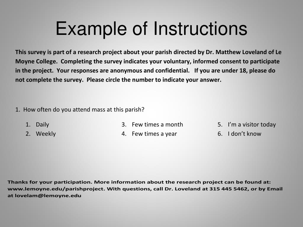 Social Desirability Example • 1. How often do you attend mass at this parish? • Daily • Weekly • Few times a month • Few times a year • I’m a visitor today • I don’t know
