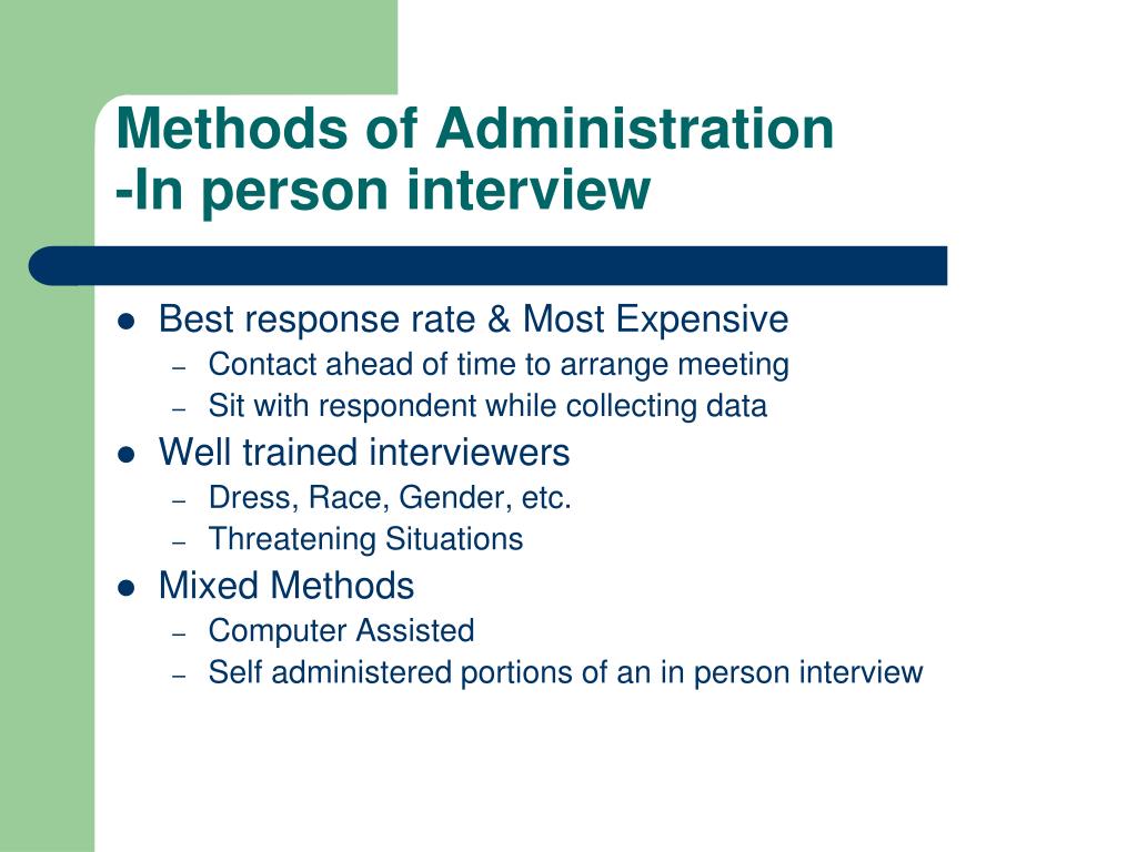 Methods of Administration-In person interview • Best response rate & Most Expensive • Contact ahead of time to arrange meeting • Sit with respondent while collecting data • Well trained interviewers • Dress, Race, Gender, etc. • Threatening Situations • Mixed Methods • Computer Assisted • Self administered portions of an in person interview