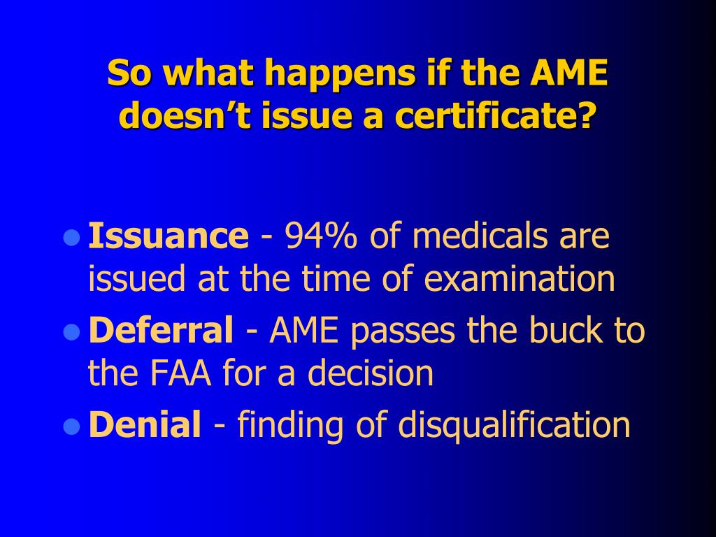 So what happens if the AME doesn’t issue a certificate? • Issuance - 94% of medicals are issued at the time of examination • Deferral - AME passes the buck to the FAA for a decision • Denial - finding of disqualification