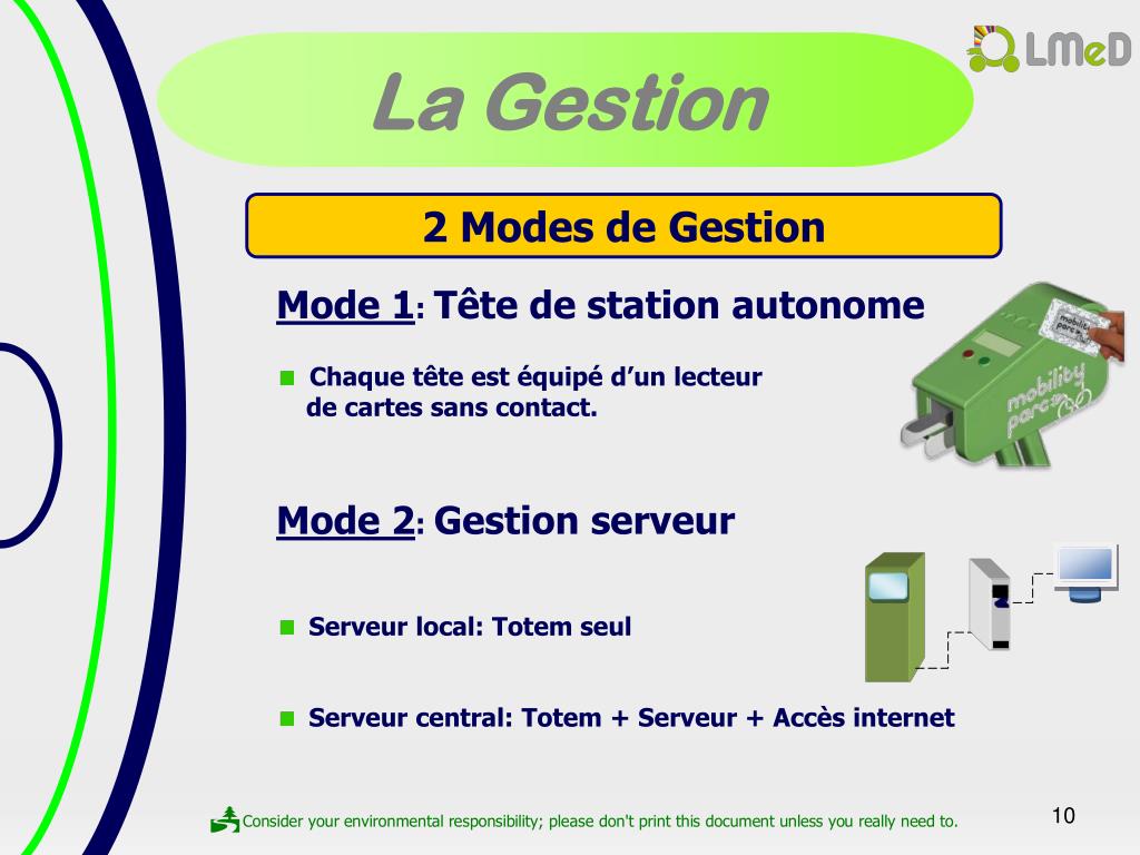 ² La Gestion 2 Modes de Gestion • Mode 1: Tête de station autonome • Chaque tête est équipé d’un lecteur • de cartes sans contact. • Mode 2: Gestion serveur • Serveur local: Totem seul • Serveur central: Totem + Serveur + Accès internet