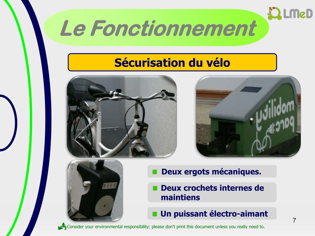 Le Fonctionnement Sécurisation du vélo • Deux ergots mécaniques. • Deux crochets internes de maintiens • Un puissant électro-aimant
