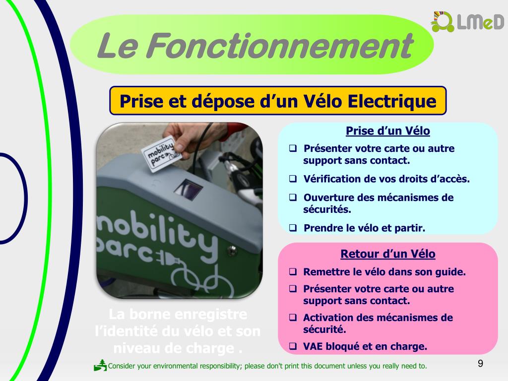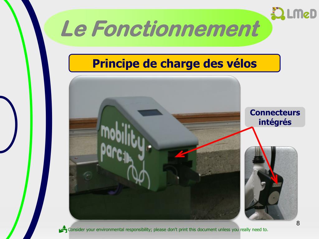 25/07/2011. Mobility Parc by LMeD. Borne de stationnement et recharge de vélos électriques. Mobility Parc. Pourquoi Mobility Parc ?. Pour mettre en place un mode de déplacement doux alternatif à la voiture, sécurisé, simple et rapide à disposition de ses salariés.