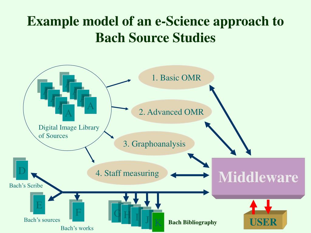 Example model of an e-Science approach to Bach Source Studies 1. Basic OMR A A A A A A A 2. Advanced OMR A Digital Image Library of Sources 3. Graphoanalysis Middleware D 4. Staff measuring Bach’s Scribe E F G H I J K Bach’s sources USER Bach Bibliography Bach’s works