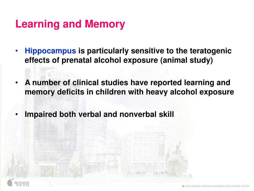 Learning and Memory • Hippocampus is particularly sensitive to the teratogenic effects of prenatal alcohol exposure (animal study) • A number of clinical studies have reported learning and memory deficits in children with heavy alcohol exposure • Impaired both verbal and nonverbal skill