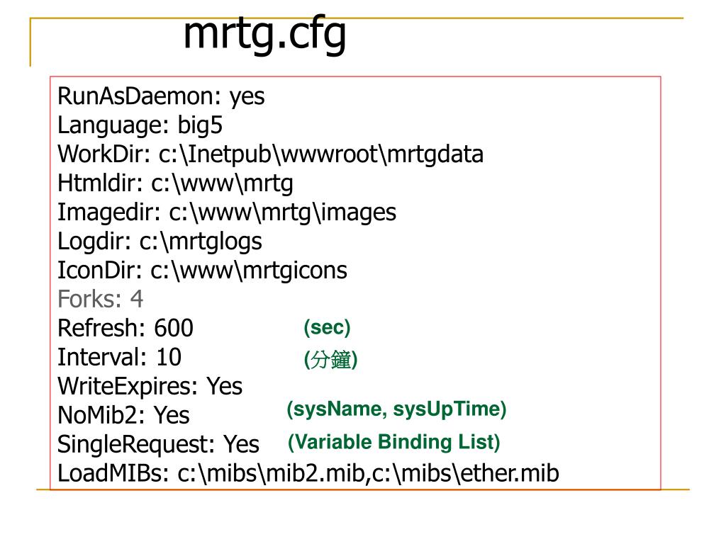 mrtg.cfg RunAsDaemon: yes Language: big5 WorkDir: c:\Inetpub\wwwroot\mrtgdata Htmldir: c:\www\mrtg Imagedir: c:\www\mrtg\images Logdir: c:\mrtglogs IconDir: c:\www\mrtgicons Forks: 4 Refresh: 600 Interval: 10 WriteExpires: Yes NoMib2: Yes SingleRequest: Yes LoadMIBs: c:\mibs\mib2.mib,c:\mibs\ether.mib (sec) (分鐘) (sysName, sysUpTime) (Variable Binding List)