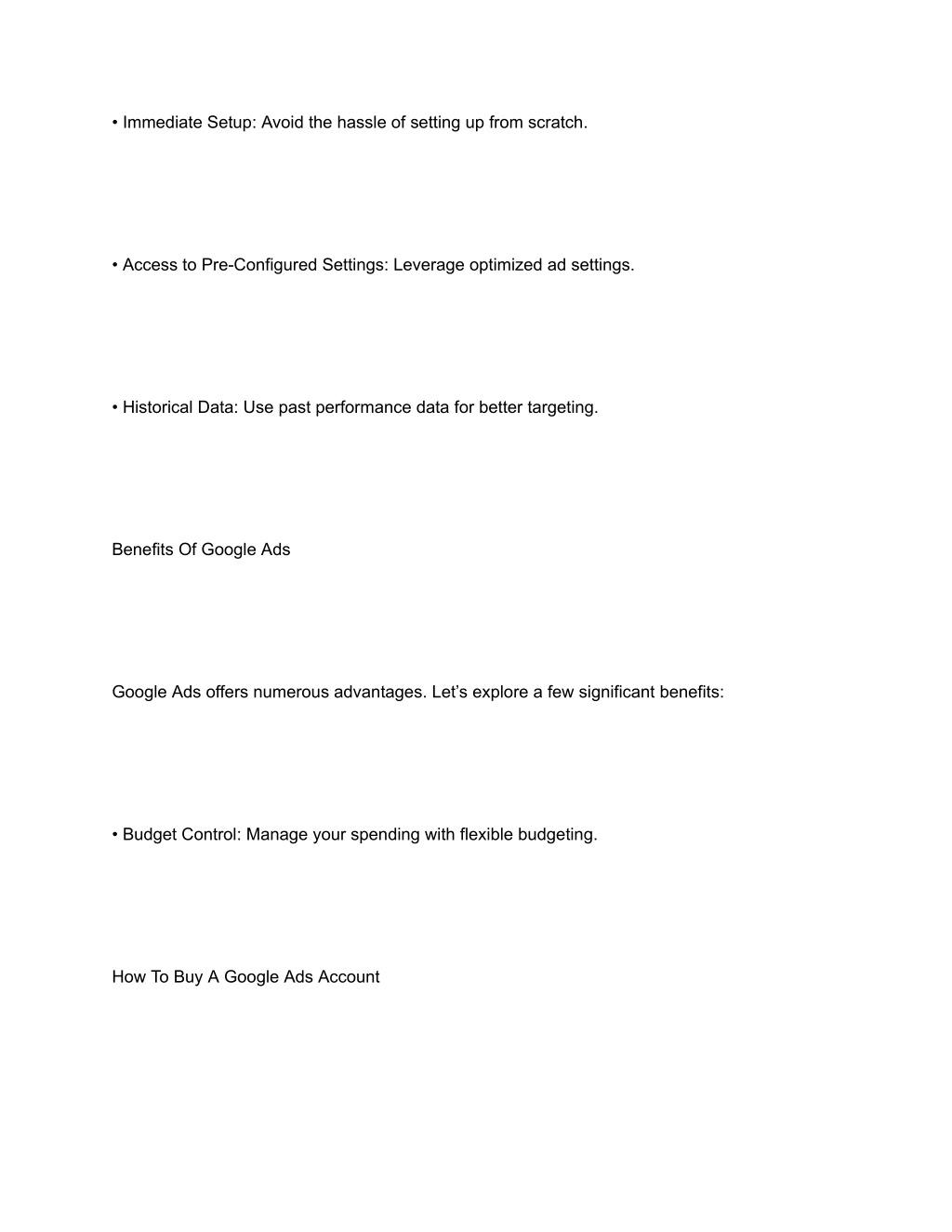 • Immediate Setup: Avoid the hassle of setting up from scratch. • Access to Pre-Configured Settings: Leverage optimized ad settings. • Historical Data: Use past performance data for better targeting. Benefits Of Google Ads Google Ads offers numerous advantages. Let’s explore a few significant benefits: • Budget Control: Manage your spending with flexible budgeting. How To Buy A Google Ads Account