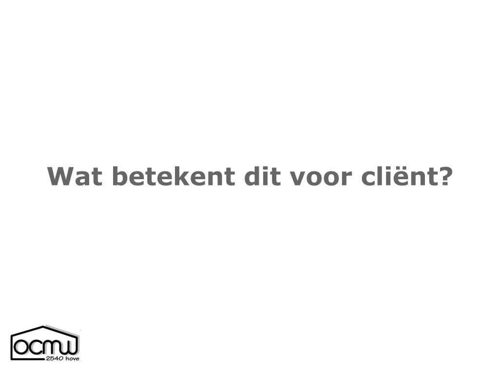 Wat betekent dit voor cliënt? • Voelt zich door iedereen ‘tekort gedaan’ • Voelt zich bedreigd en niet geholpen • Vreest ‘samenzwering’ met zijn ex-echtgenote • Vreest uit zijn huis gezet te worden • Wil uit trots niet afhankelijk zijn van hulpverlening