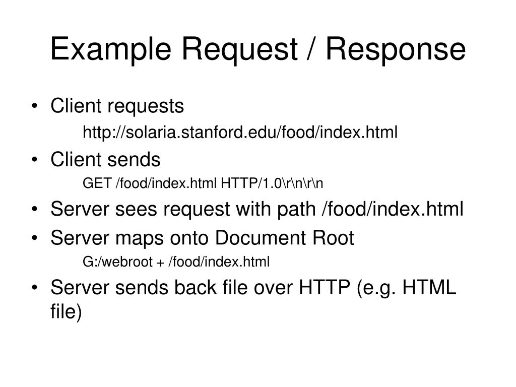 Example Request / Response • Client requests http://solaria.stanford.edu/food/index.html • Client sends GET /food/index.html HTTP/1.0\r\n\r\n • Server sees request with path /food/index.html • Server maps onto Document Root G:/webroot + /food/index.html • Server sends back file over HTTP (e.g. HTML file)