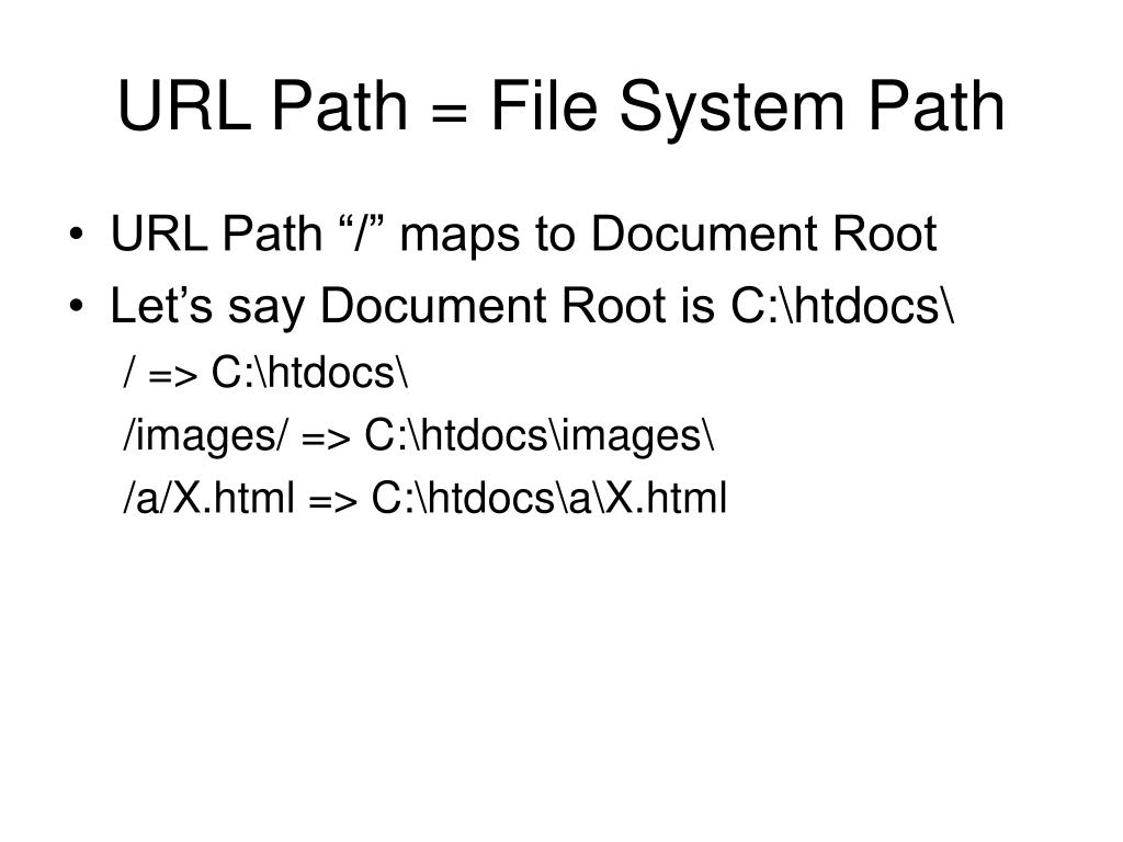 URL Path = File System Path • URL Path “/” maps to Document Root • Let’s say Document Root is C:\htdocs\ / => C:\htdocs\ /images/ => C:\htdocs\images\ /a/X.html => C:\htdocs\a\X.html