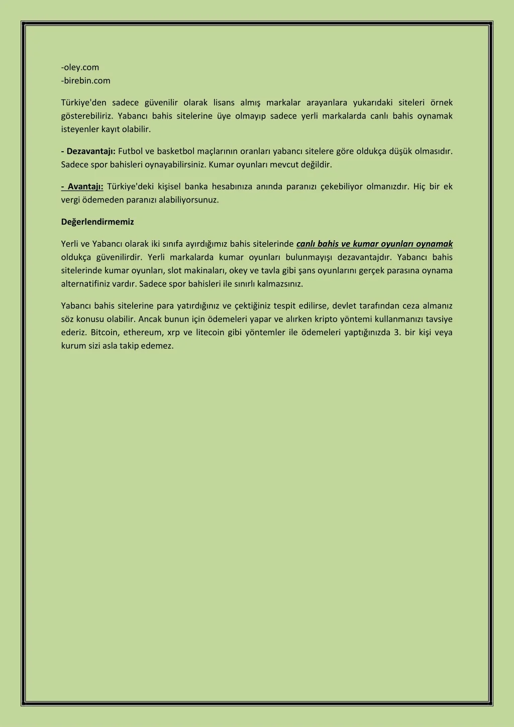 -oley.com -birebin.com Türkiye'den sadece güvenilir olarak lisans almış markalar arayanlara yukarıdaki siteleri örnek gösterebiliriz. Yabancı bahis sitelerine üye olmayıp sadece yerli markalarda canlı bahis oynamak isteyenler kayıt olabilir. - Dezavantajı: Futbol ve basketbol maçlarının oranları yabancı sitelere göre oldukça düşük olmasıdır. Sadece spor bahisleri oynayabilirsiniz. Kumar oyunları mevcut değildir. - Avantajı:Türkiye'deki kişisel banka hesabınıza anında paranızı çekebiliyor olmanızdır. Hiç bir ek vergi ödemeden paranızı alabiliyorsunuz. Değerlendirmemiz Yerli ve Yabancı olarak iki sınıfa ayırdığımız bahis sitelerinde canlı bahis ve kumar oyunları oynamak oldukça güvenilirdir. Yerli markalarda kumar oyunları bulunmayışı dezavantajdır. Yabancı bahis sitelerinde kumar oyunları, slot makinaları, okey ve tavla gibi şans oyunlarını gerçek parasına oynama alternatifiniz vardır. Sadece spor bahisleri ile sınırlı kalmazsınız. Yabancı bahis sitelerine para yatırdığınız ve çektiğiniz tespit edilirse, devlet tarafından ceza almanız söz konusu olabilir. Ancak bunun için ödemeleri yapar ve alırken kripto yöntemi kullanmanızı tavsiye ederiz. Bitcoin, ethereum, xrp ve litecoin gibi yöntemler ile ödemeleri yaptığınızda 3. bir kişi veya kurum sizi asla takip edemez.