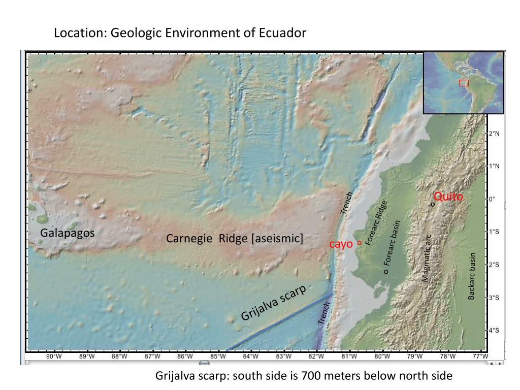 Jonathan W. Mies Department of Physics, Geology, and Astronomy The University of Tennessee at Chattanooga Location: Geologic Environment of Ecuador Quito Trench o Forearc Ridge Galapagos Carnegie Ridge [aseismic] cayo o Forearc basin Magmatic arc o Backarc basin Grijalva scarp Trench Grijalva scarp: south side is 700 meters below north side