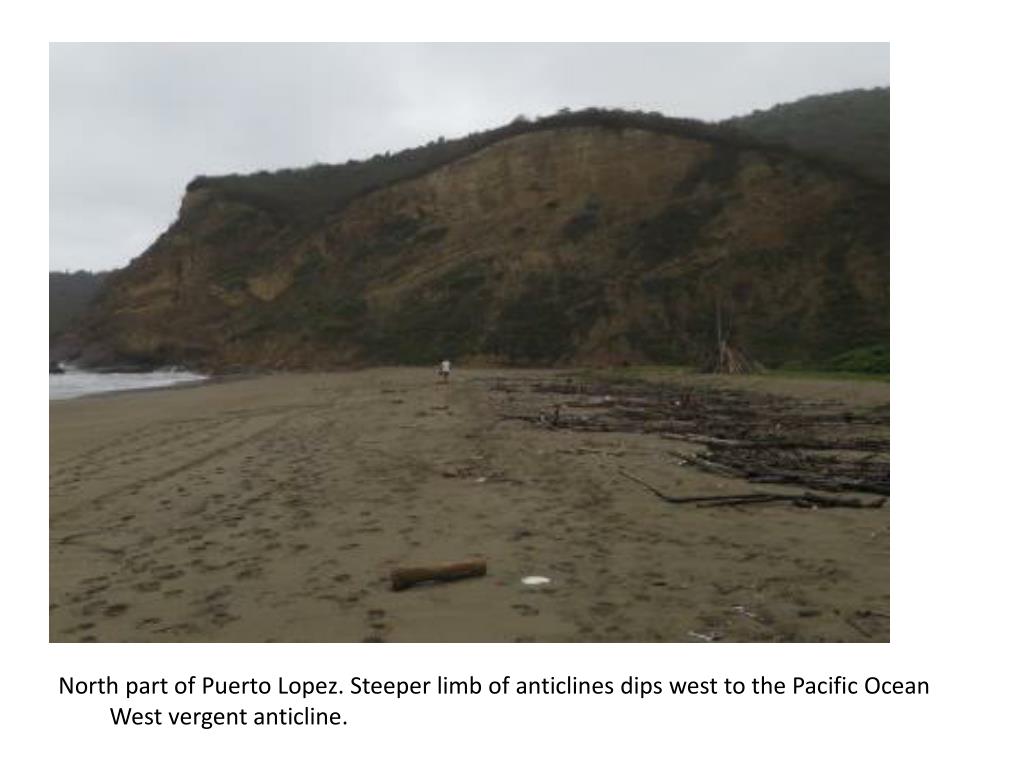 North part of Puerto Lopez. Steeper limb of anticlines dips west to the Pacific Ocean • West vergent anticline.