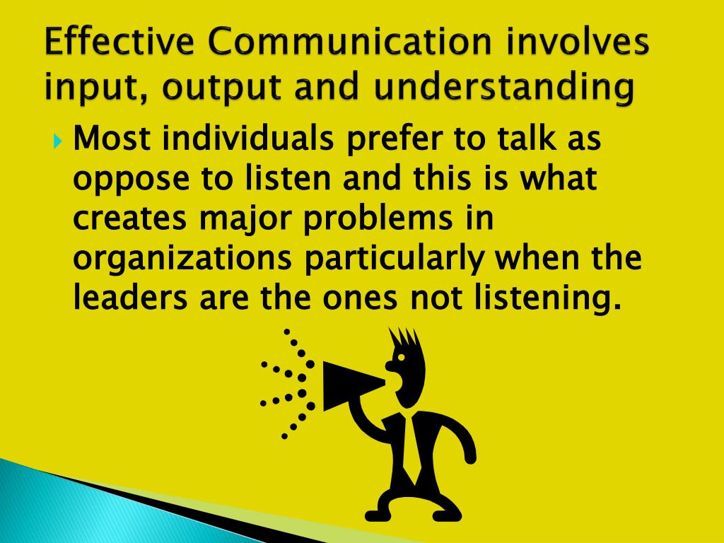 Effective Communication involves input, output and understanding • Most individuals prefer to talk as oppose to listen and this is what creates major problems in organizations particularly when the leaders are the ones not listening.