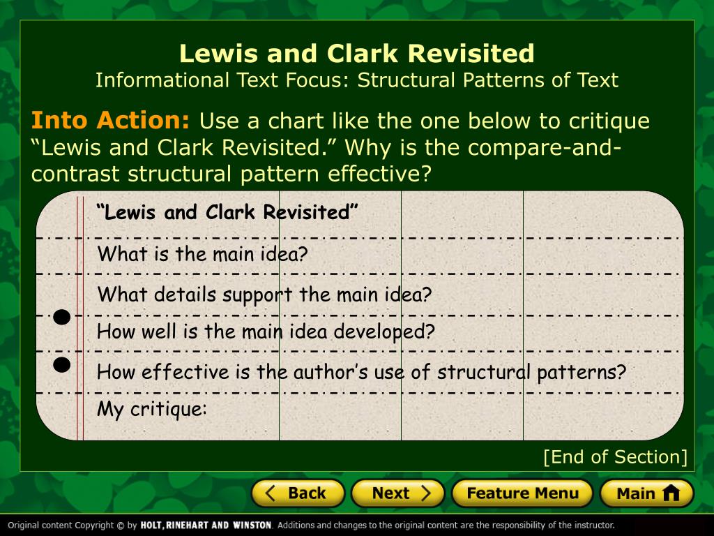 Lewis and Clark Revisited Informational Text Focus: Structural Patterns of Text Into Action:Use a chart like the one below to critique “Lewis and Clark Revisited.” Why is the compare-and-contrast structural pattern effective? “Lewis and Clark Revisited” What is the main idea? What details support the main idea? How well is the main idea developed? How effective is the author’s use of structural patterns? My critique: [End of Section]