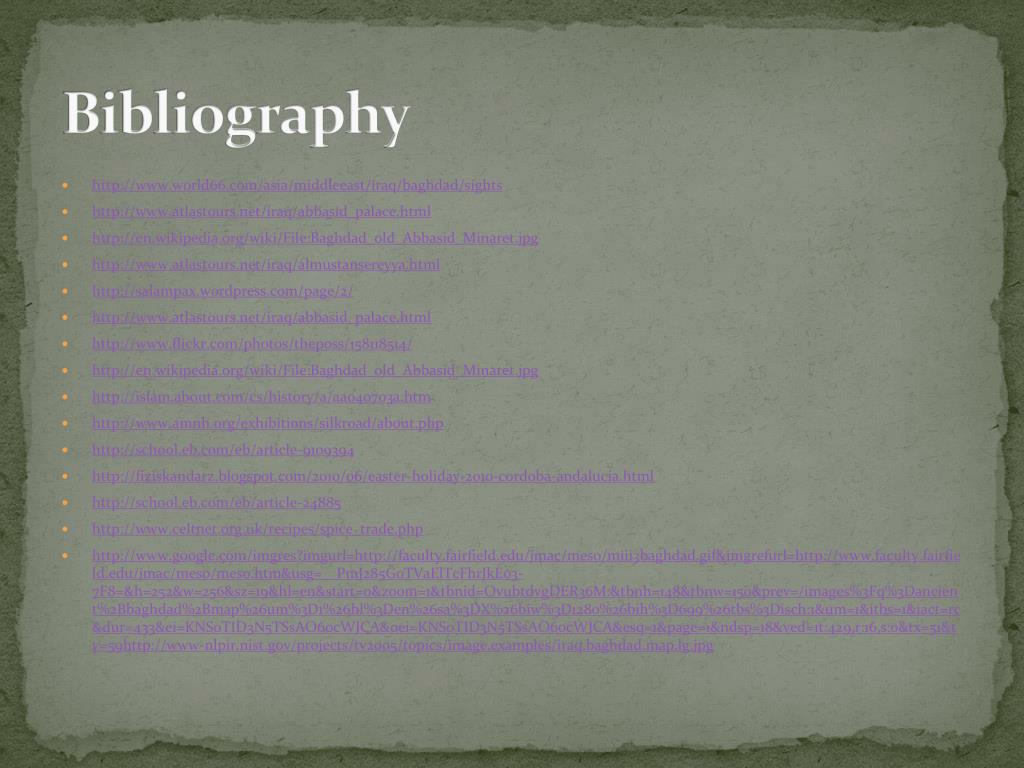 Bibliography • http://www.world66.com/asia/middleeast/iraq/baghdad/sights • http://www.atlastours.net/iraq/abbasid_palace.html • http://en.wikipedia.org/wiki/File:Baghdad_old_Abbasid_Minaret.jpg • http://www.atlastours.net/iraq/almustansereyya.html • http://salampax.wordpress.com/page/2/ • http://www.atlastours.net/iraq/abbasid_palace.html • http://www.flickr.com/photos/theposs/158118514/ • http://en.wikipedia.org/wiki/File:Baghdad_old_Abbasid_Minaret.jpg • http://islam.about.com/cs/history/a/aa040703a.htm • http://www.amnh.org/exhibitions/silkroad/about.php • http://school.eb.com/eb/article-9109394 • http://fiziskandarz.blogspot.com/2010/06/easter-holiday-2010-cordoba-andalucia.html • http://school.eb.com/eb/article-24885 • http://www.celtnet.org.uk/recipes/spice_trade.php • http://www.google.com/imgres?imgurl=http://faculty.fairfield.edu/jmac/meso/miii3baghdad.gif&imgrefurl=http://www.faculty.fairfield.edu/jmac/meso/meso.htm&usg=__PmJ285G0TVaElTcFhrJkEo3-7F8=&h=252&w=256&sz=19&hl=en&start=0&zoom=1&tbnid=OvubtdvgDER36M:&tbnh=148&tbnw=150&prev=/images%3Fq%3Dancient%2Bbaghdad%2Bmap%26um%3D1%26hl%3Den%26sa%3DX%26biw%3D1280%26bih%3D699%26tbs%3Disch:1&um=1&itbs=1&iact=rc&dur=433&ei=KNS0TID3N5TSsAO6ocWJCA&oei=KNS0TID3N5TSsAO6ocWJCA&esq=1&page=1&ndsp=18&ved=1t:429,r:16,s:0&tx=51&ty=59http://www-nlpir.nist.gov/projects/tv2005/topics/image.examples/iraq.baghdad.map.lg.jpg