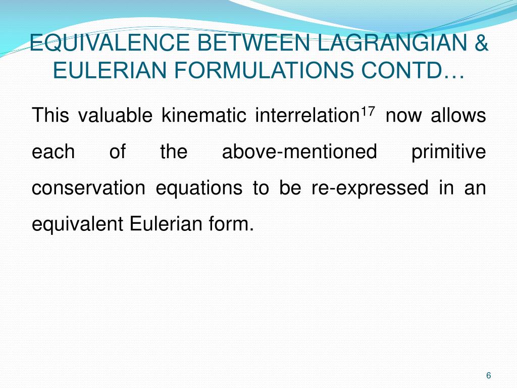 EQUIVALENCE BETWEEN LAGRANGIAN & EULERIAN FORMULATIONS CONTD… This valuable kinematic interrelation17 now allows each of the above-mentioned primitive conservation equations to be re-expressed in an equivalent Eulerian form.