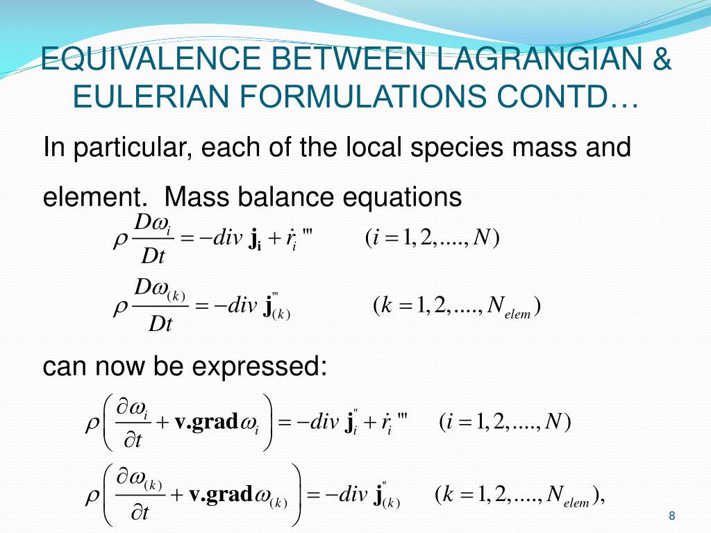 EQUIVALENCE BETWEEN LAGRANGIAN & EULERIAN FORMULATIONS CONTD… In particular, each of the local species mass and element. Mass balance equations can now be expressed:
