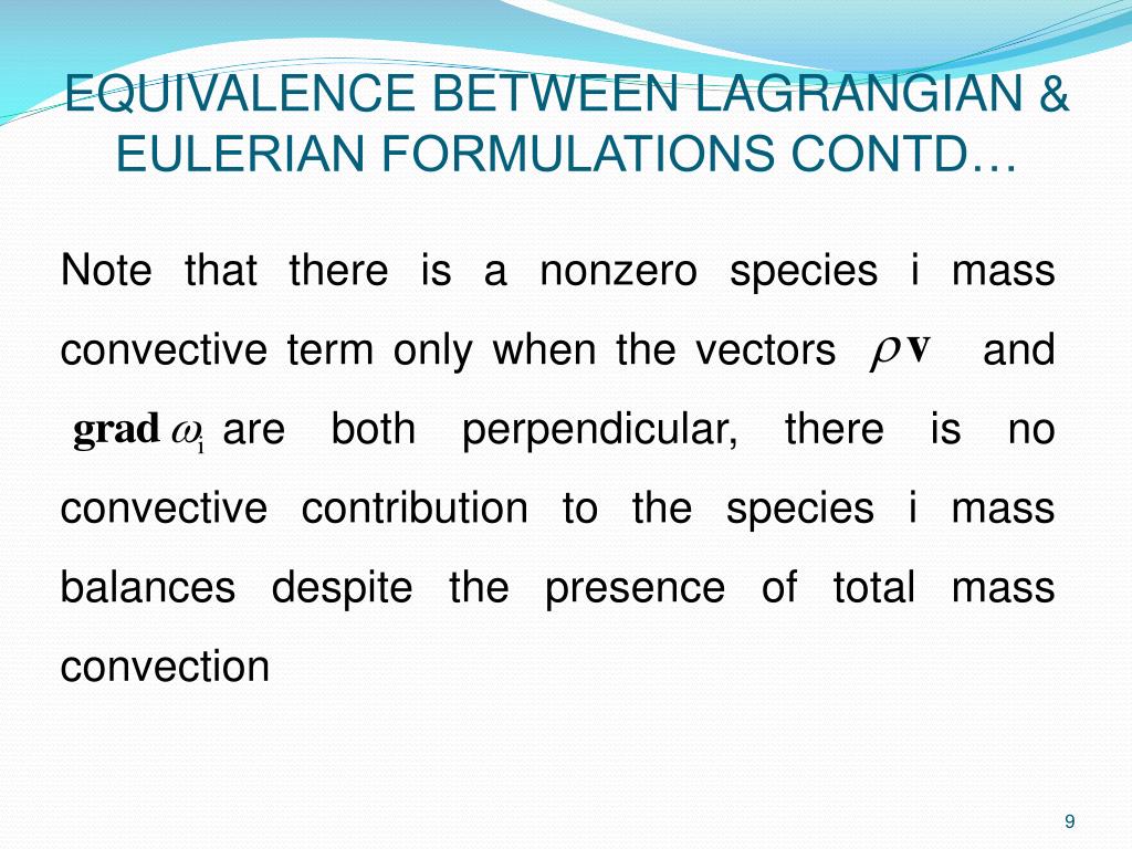 EQUIVALENCE BETWEEN LAGRANGIAN & EULERIAN FORMULATIONS CONTD… Note that there is a nonzero species i mass convective term only when the vectors and are both perpendicular, there is no convective contribution to the species i mass balances despite the presence of total mass convection