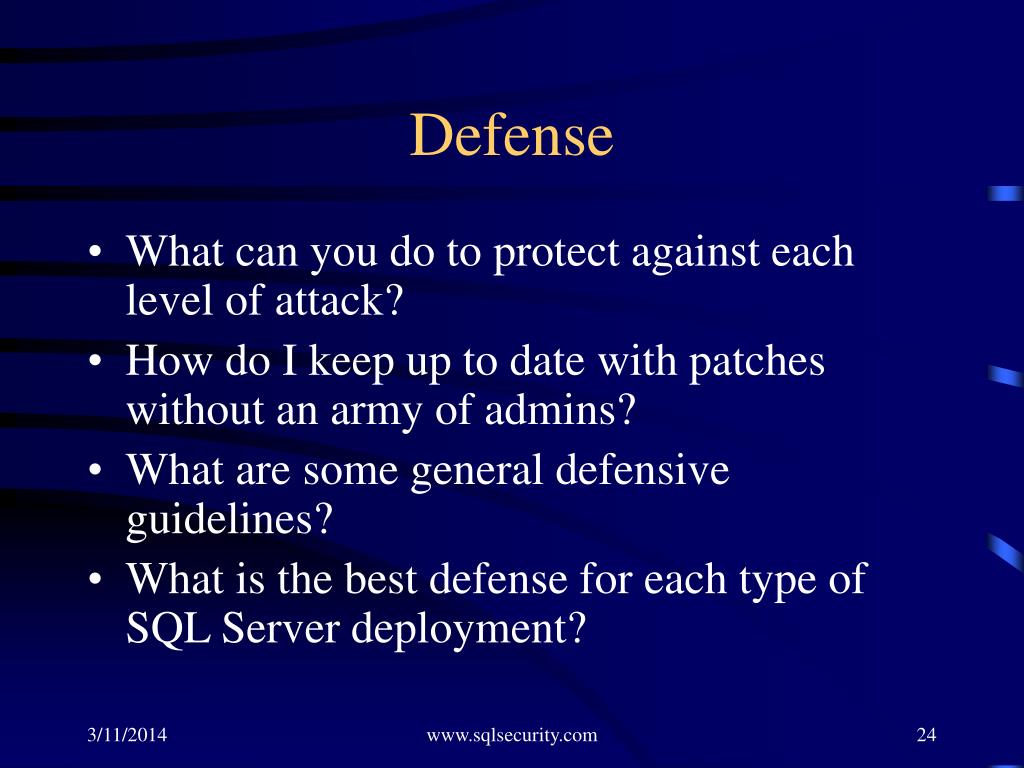 Defense • What can you do to protect against each level of attack? • How do I keep up to date with patches without an army of admins? • What are some general defensive guidelines? • What is the best defense for each type of SQL Server deployment? www.sqlsecurity.com