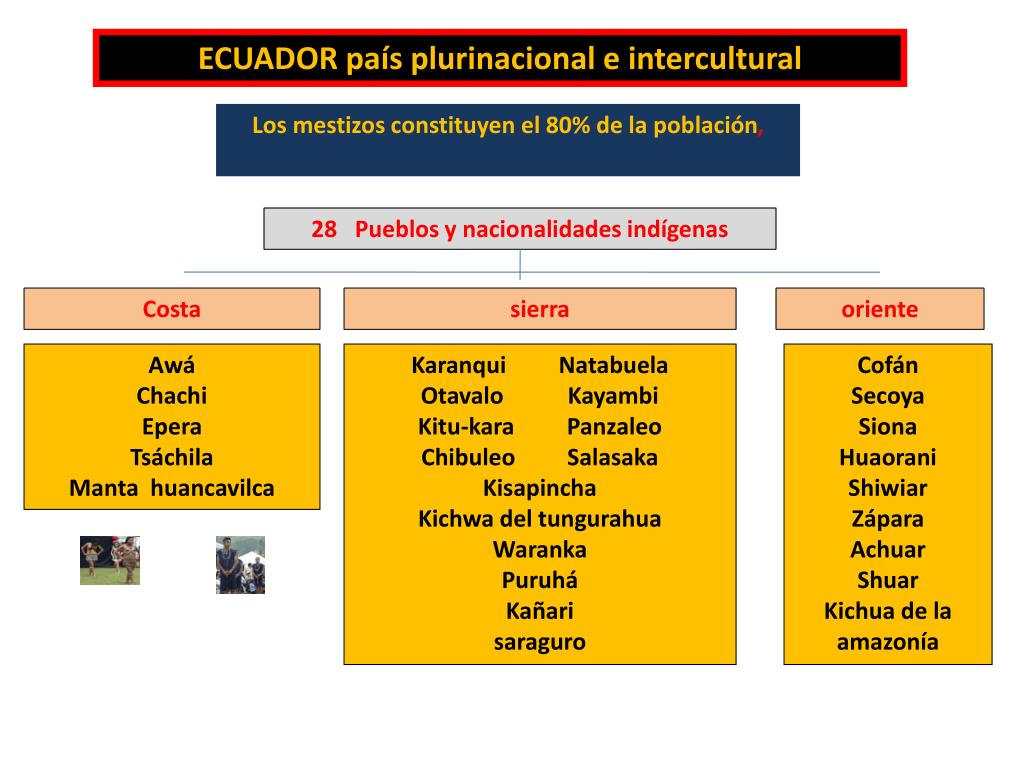 ECUADOR país plurinacional e intercultural Los mestizos constituyen el 80% de la población, 28 Pueblos y nacionalidades indígenas Costa sierra oriente Awá Chachi Epera Tsáchila Manta huancavilca Karanqui Natabuela Otavalo Kayambi Kitu-kara Panzaleo Chibuleo Salasaka Kisapincha Kichwa del tungurahua Waranka Puruhá Kañari saraguro Cofán Secoya Siona Huaorani Shiwiar Zápara Achuar Shuar Kichua de la amazonía