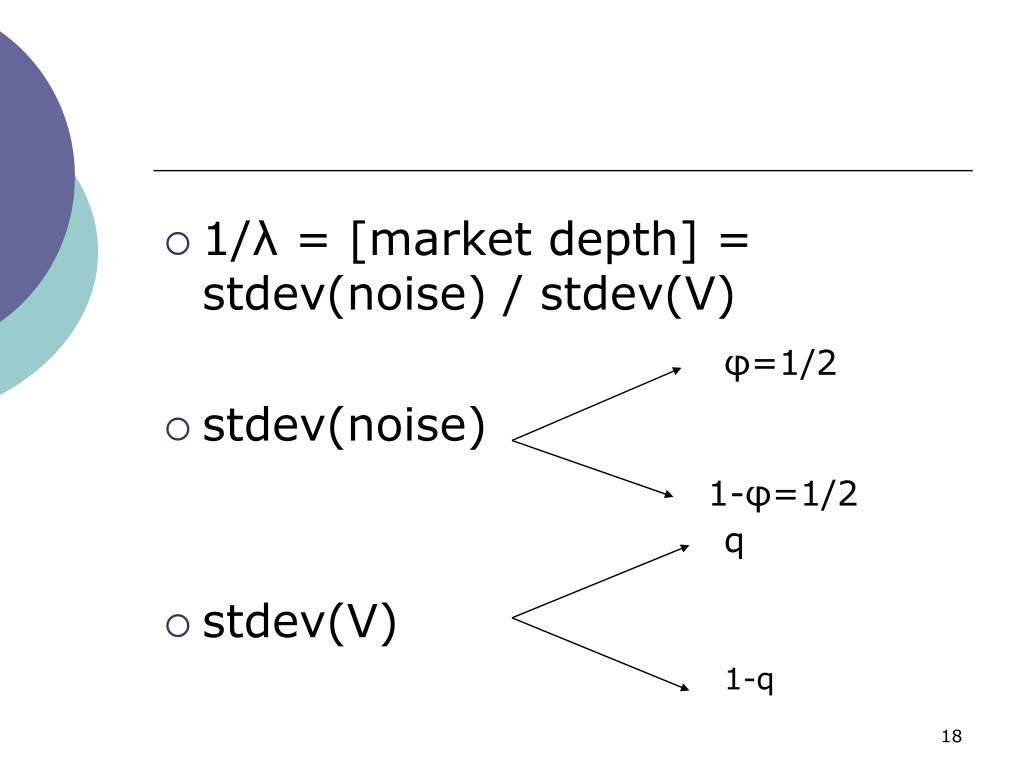 1/λ = [market depth] = stdev(noise) / stdev(V) • stdev(noise) • stdev(V) φ=1/2 1-φ=1/2 q 1-q