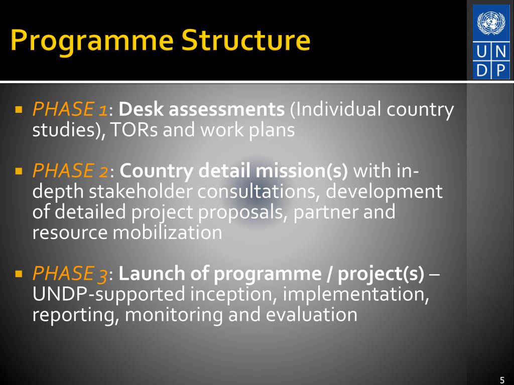 Programme Structure • PHASE 1: Desk assessments (Individual country studies), TORs and work plans • PHASE 2: Country detail mission(s) with in-depth stakeholder consultations, development of detailed project proposals, partner and resource mobilization • PHASE 3: Launch of programme / project(s) – UNDP-supported inception, implementation, reporting, monitoring and evaluation
