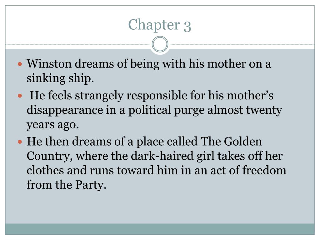 Chapter 3 Winston dreams of being with his mother on a sinking ship. He feels strangely responsible for his mother’s disappearance in a political purge almost twenty years ago. He then dreams of a place called The Golden Country, where the dark-haired girl takes off her clothes and runs toward him in an act of freedom from the Party.