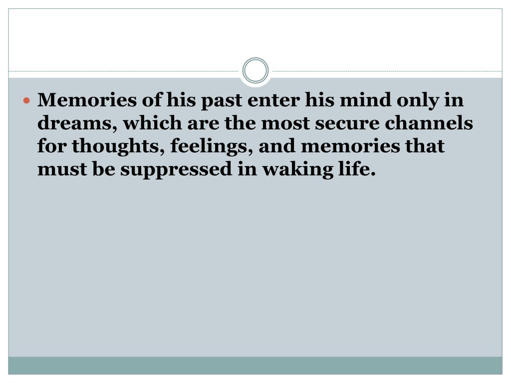 Memories of his past enter his mind only in dreams, which are the most secure channels for thoughts, feelings, and memories that must be suppressed in waking life.