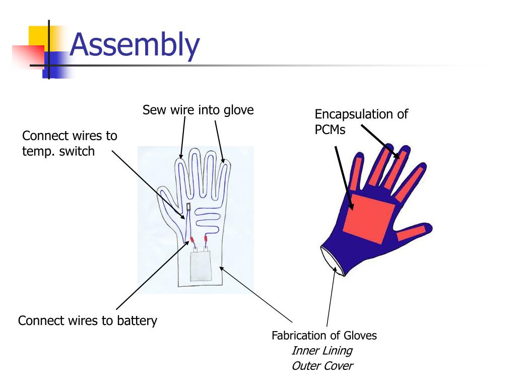 Assembly Fabrication of Gloves Inner Lining Outer Cover Sew wire into glove Encapsulation of PCMs Connect wires to temp. switch Connect wires to battery