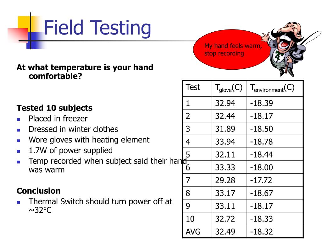 Field Testing My hand feels warm, stop recording At what temperature is your hand comfortable? Tested 10 subjects • Placed in freezer • Dressed in winter clothes • Wore gloves with heating element • 1.7W of power supplied • Temp recorded when subject said their hand was warm Conclusion • Thermal Switch should turn power off at ~32C