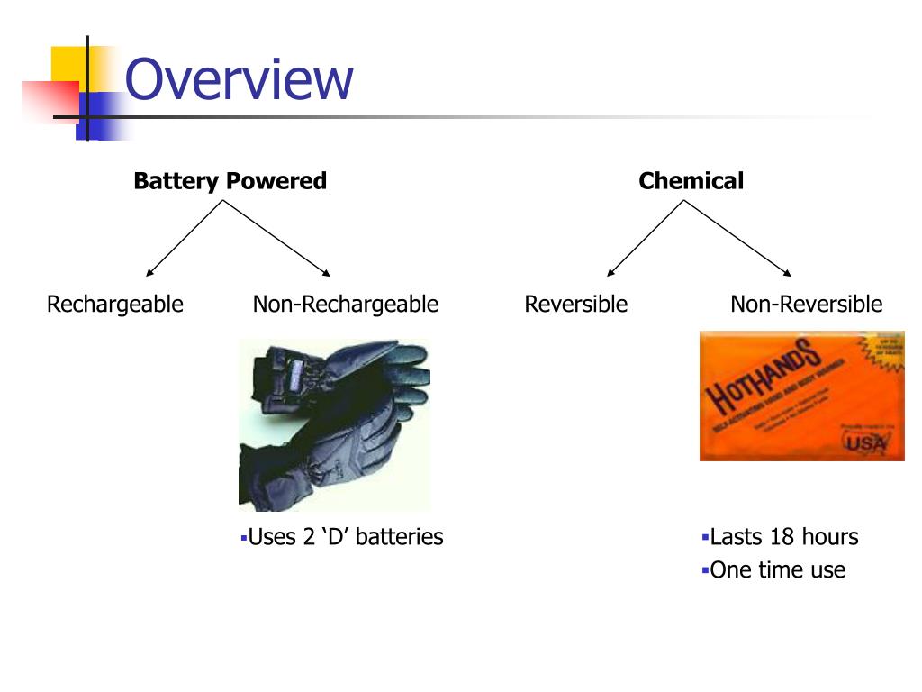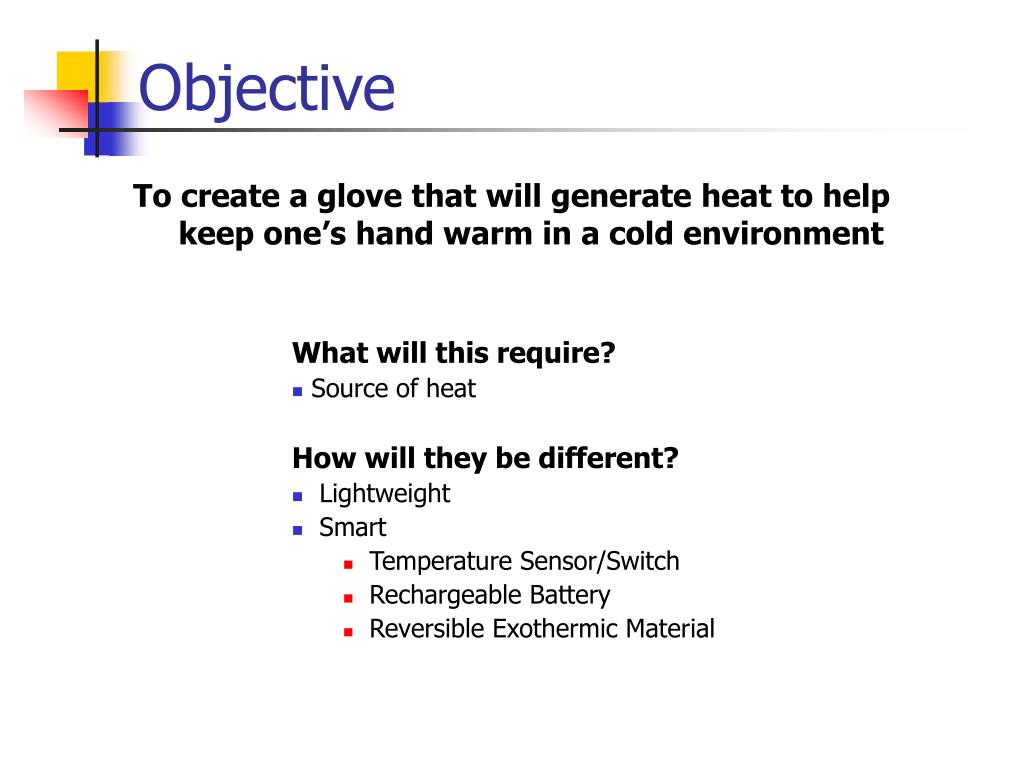 Objective To create a glove that will generate heat to help keep one’s hand warm in a cold environment • What will this require? • Source of heat • How will they be different? • Lightweight • Smart • Temperature Sensor/Switch • Rechargeable Battery • Reversible Exothermic Material