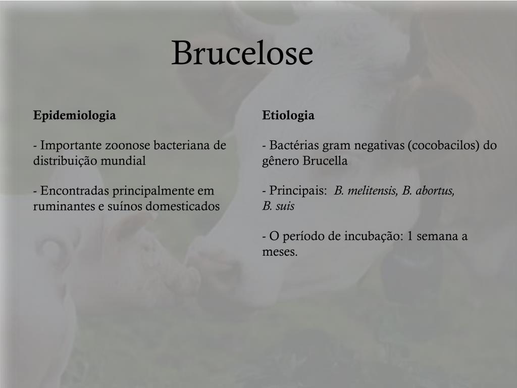 Brucelose Etiologia • - Bactérias gram negativas (cocobacilos) do gênero Brucella • - Principais: B. melitensis, B. abortus, B. suis • - O período de incubação: 1 semana a meses. Epidemiologia - Importante zoonose bacteriana de distribuição mundial - Encontradas principalmente em ruminantes e suínos domesticados