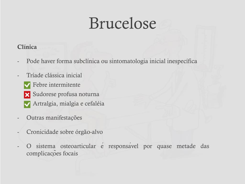 Brucelose Clínica • Pode haver forma subclínica ou sintomatologia inicial inespecífica • Tríade clássica inicial • Febre intermitente • Sudorese profusa noturna • Artralgia, mialgia e cefaléia • Outras manifestações • Cronicidade sobre órgão-alvo • O sistema osteoarticular é responsável por quase metade das complicaçõesfocais